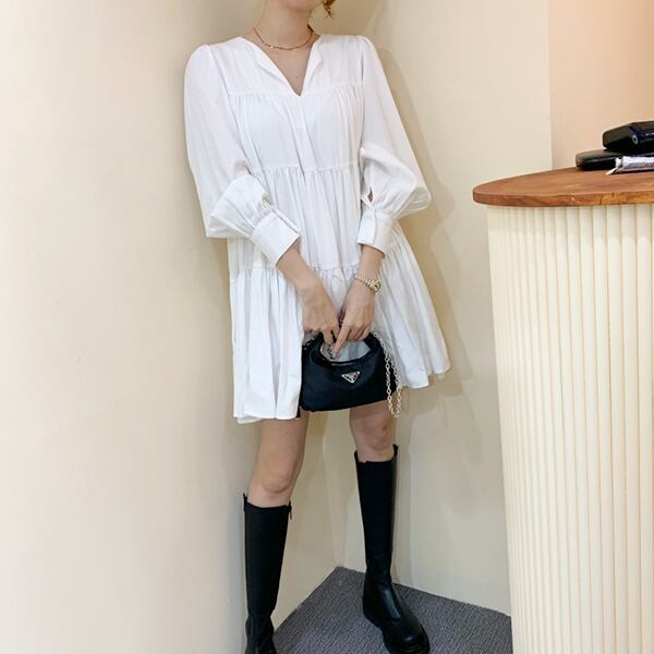 **韓国風レディース Vネックショートワンピース パフスリープ**