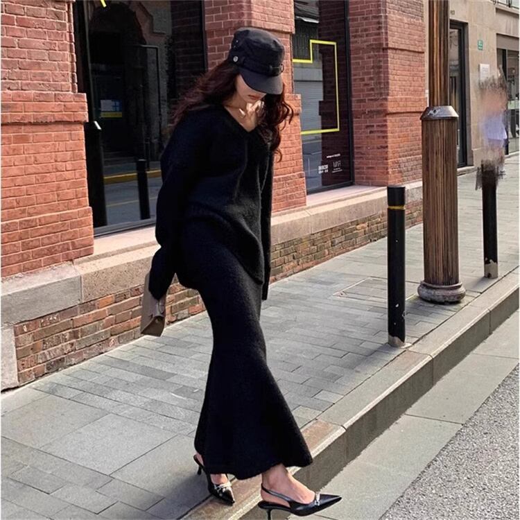 **Vネック ロングスカート ニットトップス**