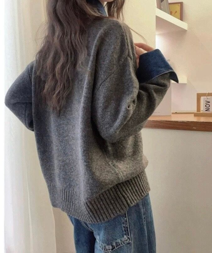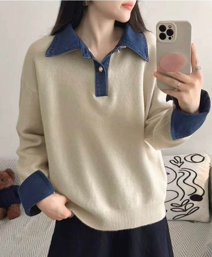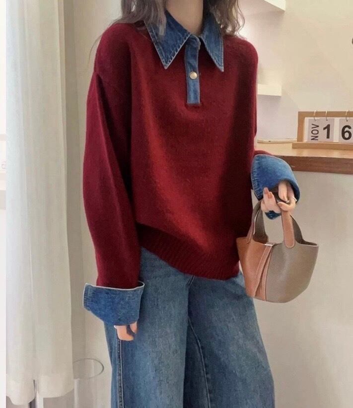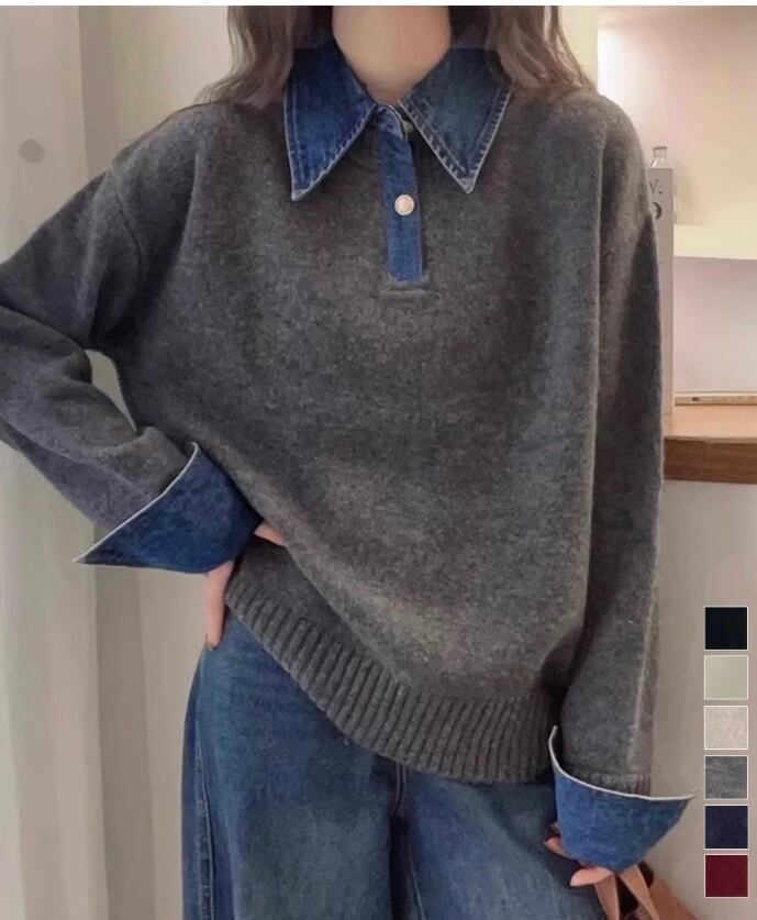 **2025秋冬新作 デニム切り替え レイヤード風ニットポロ襟**